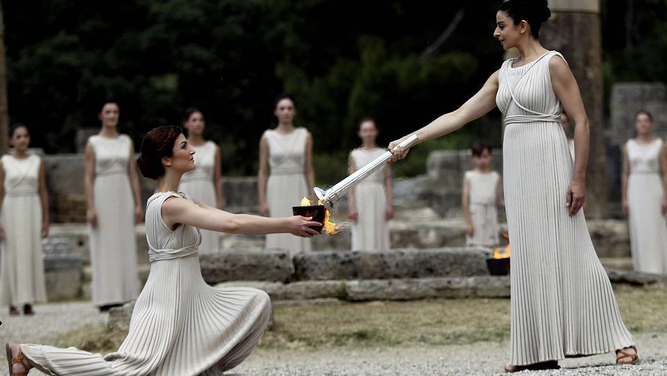 En la ceremonia del encendido de la flama olímpica, la actriz Ino Menegaki, hizo papel de Gran Sacerdotisa de Olimpia, quien escoltada por otras 10 mujeres en representación de las Vírgenes Vestales, y así entregar la llama al campeón olímpico de natación Spyros Yanniotis.
